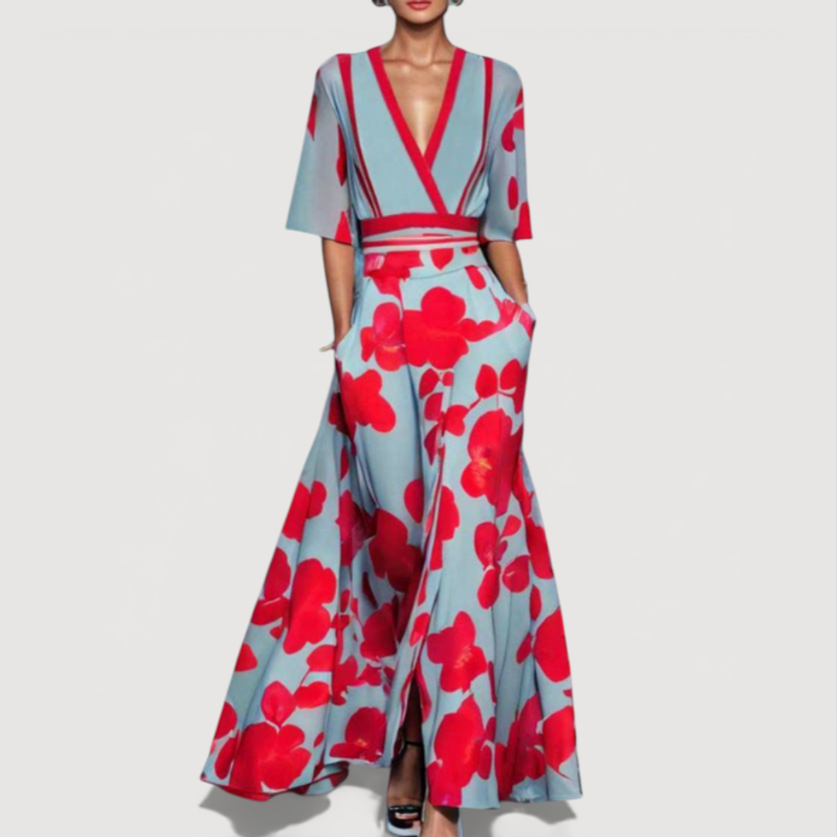 This striking maxi dress is designed to make an entrance while remaining effortlessly graceful. The flowing silhouette moves beautifully with every step, while the defined waist creates a flattering, feminine shape. Perfect for special occasions or elegant evenings, it offers confidence and poise without feeling overdone.